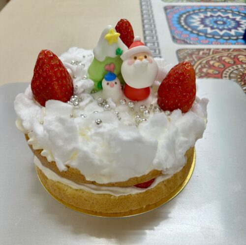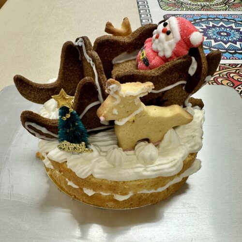 そりに乗ったサンタさんがすごい。15cmケーキにのるの??と思いましたが良い感じになりました。トナカイの型がなかったのでユニコーンの型で抜いて角をいじってトナカイにしたというコメントに「おー!」の声があがっていました。