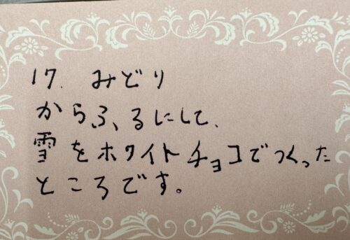 わたあめを雪に見立てたアイディアがすてきでした。ふわふわと雲の上にいるサンタさんにも見えますね。